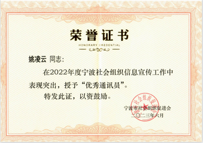 6月15日,宁波市社会组织促进会召开了二届三次会员大会,会上表彰了2022年度宁波社会组织信息宣传先进单位和优秀通讯员。学会获评“2022年度社会组织信息宣传先进单位”称号,学会会员部部长姚凌云获评“优秀通讯员”称号。