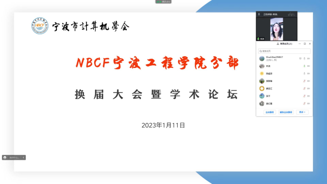 2023年1月11日上午,学会宁波工程学院分部(简称NBCF宁工分部)举行线上换届大会暨学术论坛。学会秘书长林洁、网络空间安全学院院长鲍淑娣及分部教师会员30余人参加。会议由鲍淑娣主持。