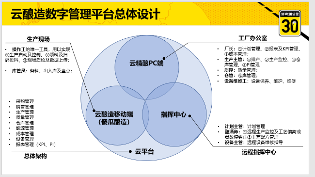 会议伊始,乐惠国际副总经理万财飞向大家介绍了乐惠国际云酿造数字管理平台,平台分为云精酿PC端、云酿造移动端和指挥中心三部分组成,运用数字化手段打通生产现场、工厂办公室、远程指挥中心各个环节,以及对生产效能的提高情况。