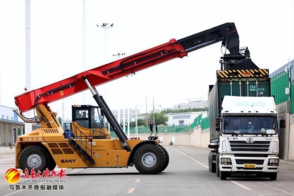 在乌鲁木齐多式联运中心,集装箱起重机正在吊装准备出口的货物。记者石磊摄