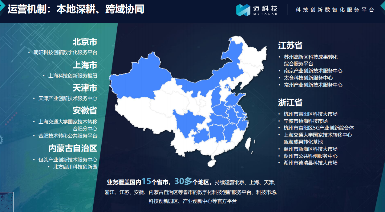 目前,迈科技已在多个省市持续运营数字化科技创新服务平台、科技市场、科技创新园区、产业创新中心等官方平台。累计服务企业超过15万家,技术转移转化量超过2000个,管理技术交易合同额超过200亿。共获得数亿元融资,市值突破10亿。逐步成长为国内领先的市场化、专业化科技服务机构。