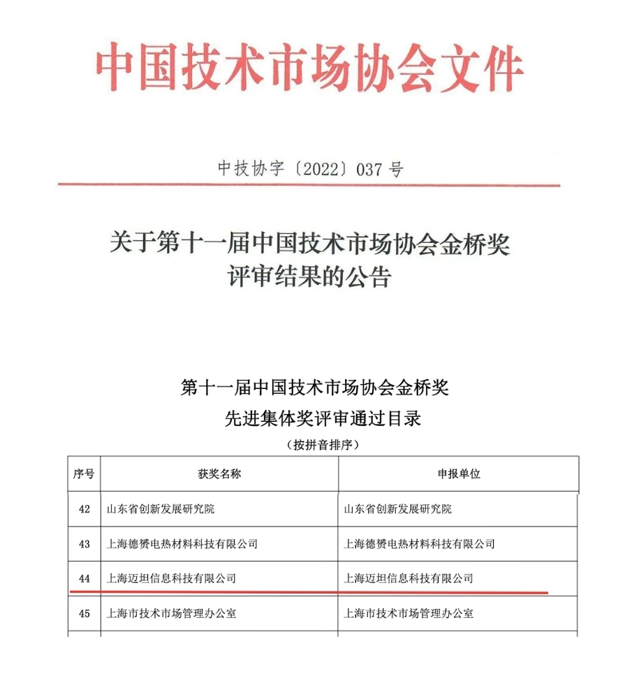 第十一届中国技术市场协会金桥奖的申报评审工作自2022年3月开始,经各推荐单位认真筛选推荐,迈科技在众多单位中脱颖而出,顺利通过金桥奖评审委员会和组织委员会的审定,获得“先进集体奖”称号。