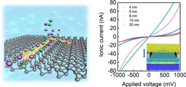 图1(左图)纳米通道中离子沿黑磷AC和ZZ晶向上表现的各向异性输运示意图;(右图)不同黑磷纳米通道中离子输运的非线性过程。