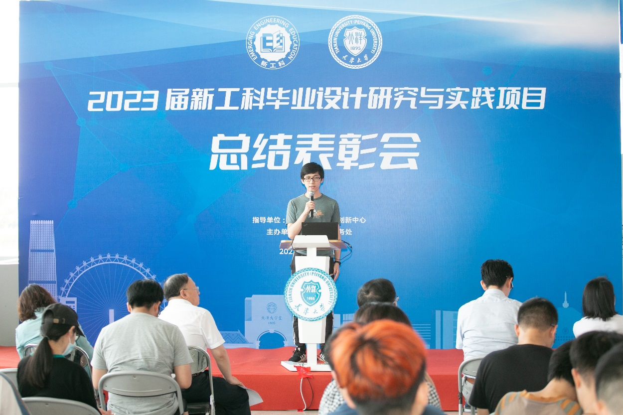 顾佩华做总结,他指出,从试点到探索、到全覆盖,天津大学用3年时间扎实推进新工科毕业设计研究与实践项目高质量实施,吸引了越来越多师生参与。2023届项目实现了工科学院的全覆盖,更加注重毕业设计切实解决实际问题,涌现出一批优秀的成果。
