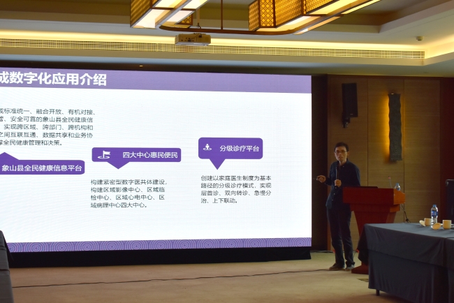 象山县卫生健康局信息中心主任鲍明海介绍了数字化改革在卫生健康行业中的应用。本次报告首先介绍了已完成的数字化应用,分为惠民、惠医、惠政三大块,以满足群众医疗需求,提升医生看病便捷度,提高管理部门服务效率。之后提出了未来县卫生健康数字化改革的思考,在已完成的三大块工作基础上,进一步实现数字化应用。