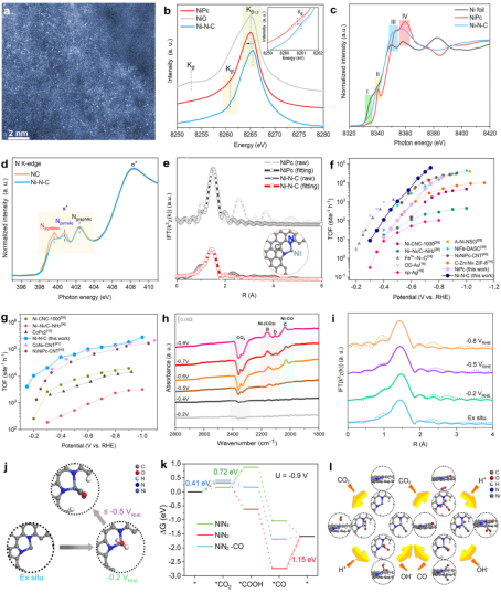 理论计算研究也表明,在电化学过程中形成的单一氧化碳吸附镍单位点上能够更好地实现关键中间体形成和一氧化碳脱附之间的平衡,这是催化剂高的催化活性的重要起源,从而很好地揭示了其在二氧化碳电还原反应中的催化机理。
