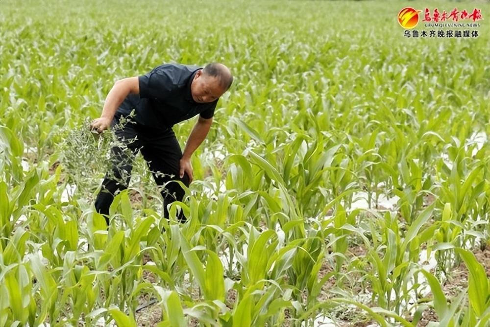 6月26日上午,水磨沟区石人子沟千亩青贮玉米长势喜人,工作人员们正在田里除草,准备开始今年第三次浇水。