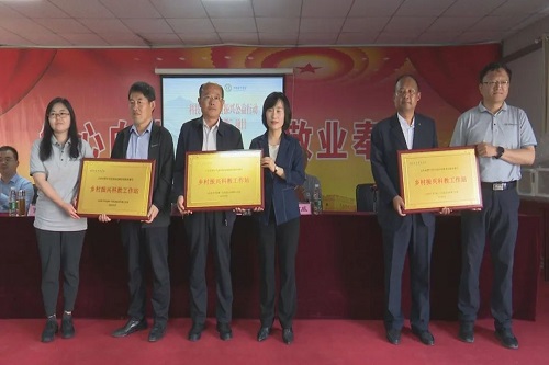 中国电子学会领导、山东电子学会领导、市科协领导向郭村中学、莱河中学、高韦庄中学捐赠教具、教材,颁发“乡村振兴科教工作站”匾牌。