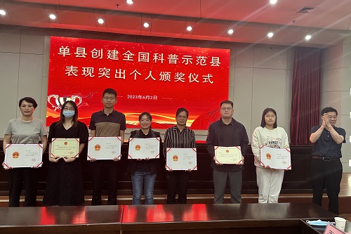 会上,县科协党组成员、副主席周媛宣读了《关于表扬单县优秀科技工作者的通报》,县科协党组成员、副主席张慧宣读了《关于对在全国科普示范县(市、区)创建等工作中表现突出的集体和个人进行及时表扬奖励的决定》,为在全国科普示范县创建工作中表现突出的先进个人代表颁发奖章和荣誉证书。