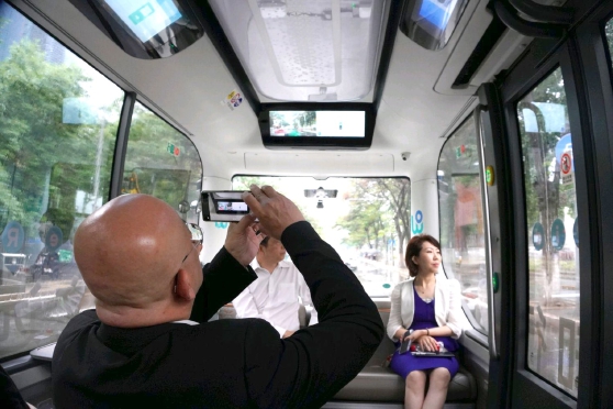 新加坡访团乘坐自动驾驶巴士。孙艳平/摄
