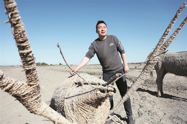 四师六十八团六连党支部副书记、连管会连长陶志强在查看连队稻草工艺品(摄于4月24日)。 杨俊钦 摄