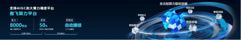 不仅如此,新华三还对傲飞算力平台进行全面升级,提供包含智能标注、智能训练、智能调优、智能部署、智能推理的全流程算力智能调度,支持8000节点的算力调度,并发训练时间缩短至50%,断点自动接续无感知训练更稳定,全方面提升大模型训练性能。