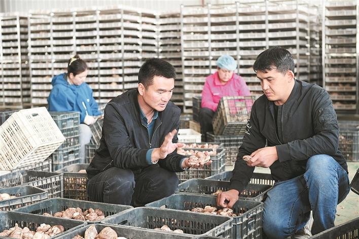 新疆农发集团农业综合服务有限公司通过打造香菇全产业链,带动三师四十四团300余人就业,人均年增收2.5万元。图为新疆农发集团农业综合服务有限公司副总经理、香菇产业园负责人谢富才(左二)在给员工讲解晾晒香菇注意事项(摄于5月18日)。李芸 摄