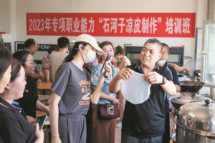 八师石河子市八毛凉皮品牌创始人姚海林(右一)在八师人社局组织的职业技能培训班上,向参加培训的学员教授凉皮制作技术(资料图片)。恩克 摄