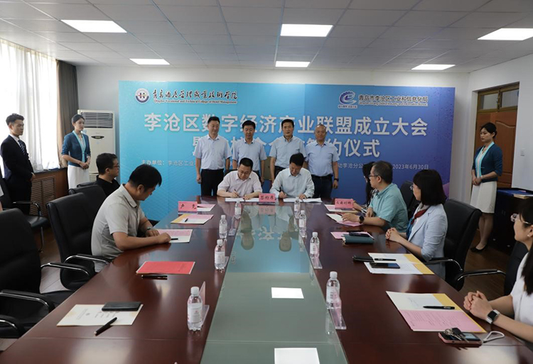 6月30日上午,李沧区数字经济产业联盟成立大会在青岛酒店管理职业技术学院举行,来自政产学研各领域的30余位专家及企业家代表齐聚一堂,围绕数字经济产业共话发展、共谋未来。李沧区政府党组成员、副区长胡文国,青岛酒店管理职业技术学院校长姜玉鹏出席活动并致辞。会上,李沧区数字经济产业联盟揭牌成立,李沧区工业和信息化局与青岛酒店管理职业技术学院信息工程技术学院签订了战略合作协议,青岛酒店管理职业技术学院学生代表与众特邦等软件企业集中签约。
