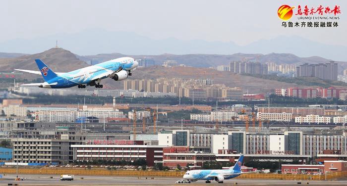 7月7日,航班在乌鲁木齐国际机场飞行区起降。资料图片