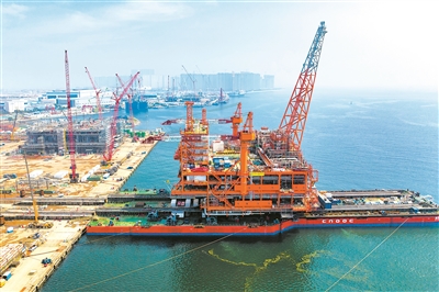 渤中19-6凝析气田一期项目中心平台装船航拍。王刚摄