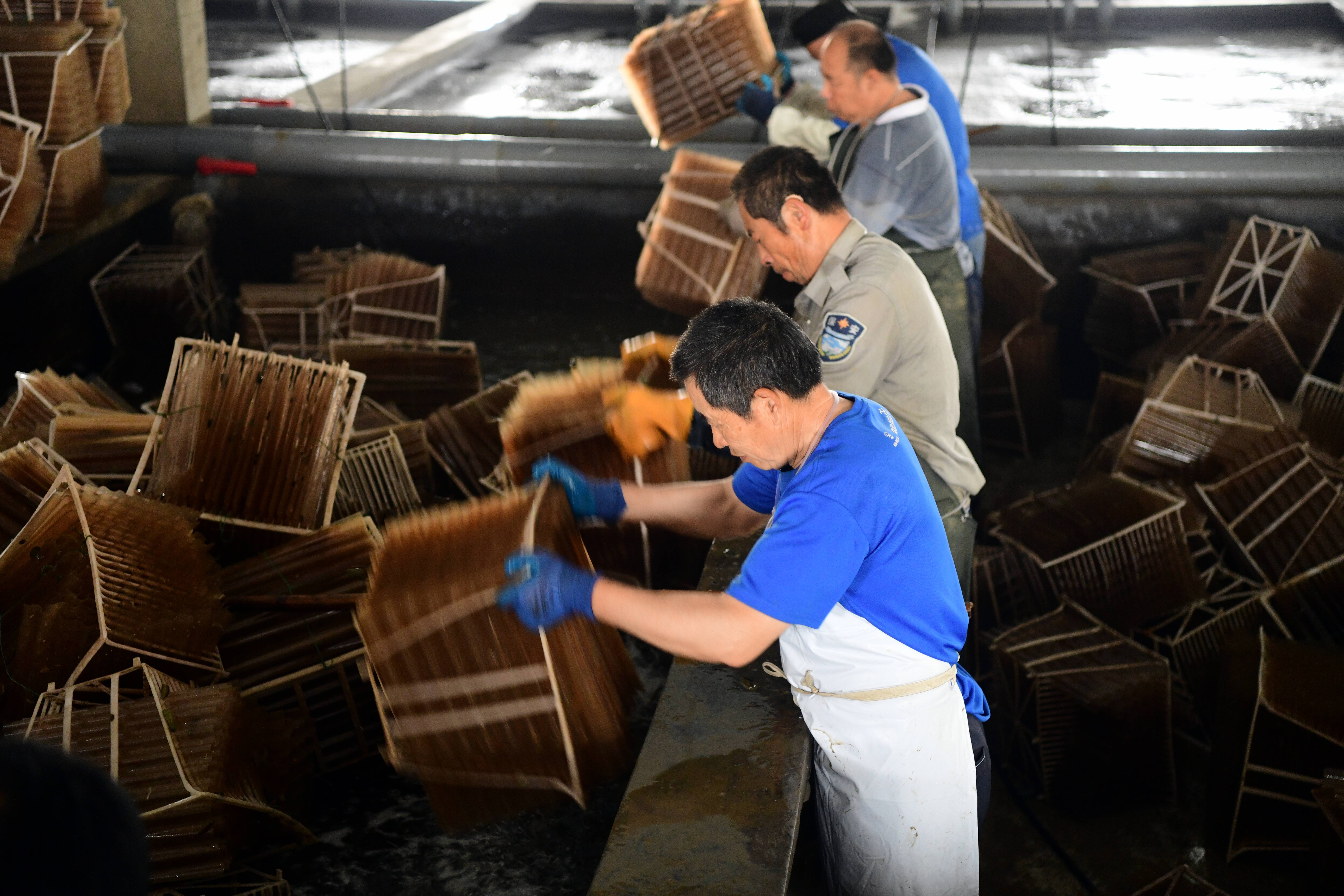 ▲工人们取出池内海参育种玻片,收获刺参苗种。记者 李涛 摄