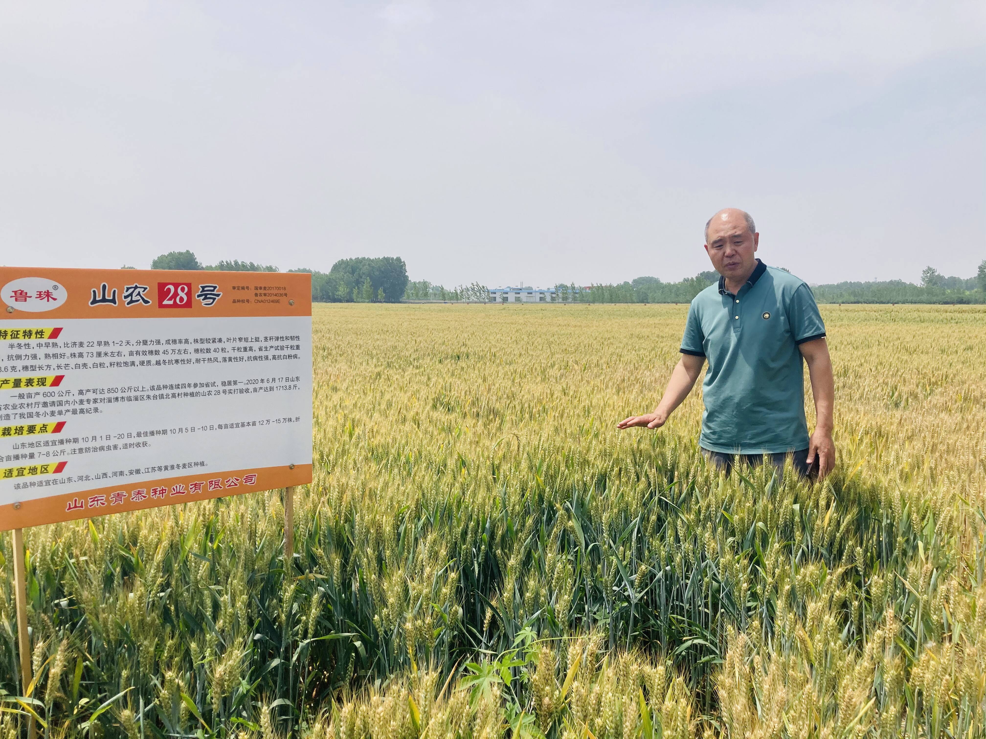 广袤麦田,麦浪翻滚。写着青麦11、山农28号、邯麦23号等小麦品种名称的木牌整齐排列在麦田中,格外显眼。当天,在泊里镇季家村,记者见到了山东青泰种业有限公司总经理丁法学,他正在麦田里观察麦种的生长状态。“这个品种是山农28号,2014年通过山东省农作物品种审定委员会审定,2017年通过国家农作物品种审定委员会审定,目前这个品种在新区已经大面积推广种植。”丁法学介绍,山农28号小麦品种抗冻、抗倒、抗病,丰产性非常好,今年亩产量有望突破1500斤。