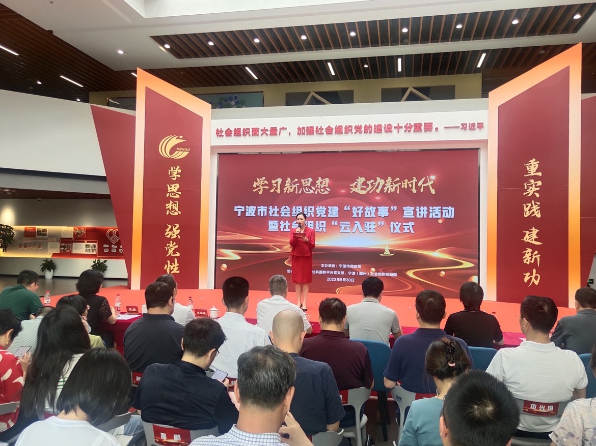 6月30日下午,为庆祝中国共产党建党102周年,深入学习贯彻习近平新时代中国特色社会主义思想,充分展示我市社会组织党建工作成果,市民政局、市社会组织综合党委在宁波(鄞州)社会组织创新园举行“学习新思想 建功新时代”宁波市社会组织党建“好故事”宣讲活动暨社会组织“云入驻”仪式。