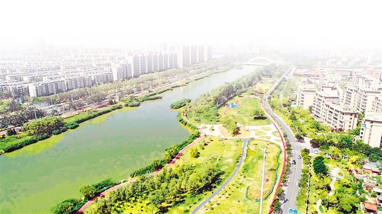 步道蜿蜒其中,鲜花点缀其间,从空中俯瞰,碧波荡漾的典农河畔,新建成的德胜滨河路生态运动公园美不胜收。