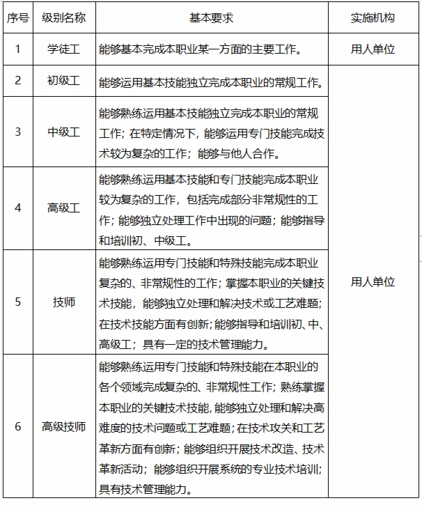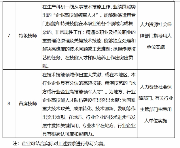 企业可结合生产实际和职业(工种)特点,健全技能岗位等级设置。对设有高级技师的职业(工种),可在其上增设特级技师和首席技师,在初级工之下补设学徒工,形成由学徒工、初级工、中级工、高级工、技师、高级技师、特级技师、首席技师构成的“新八级工”职业技能等级(岗位)序列。