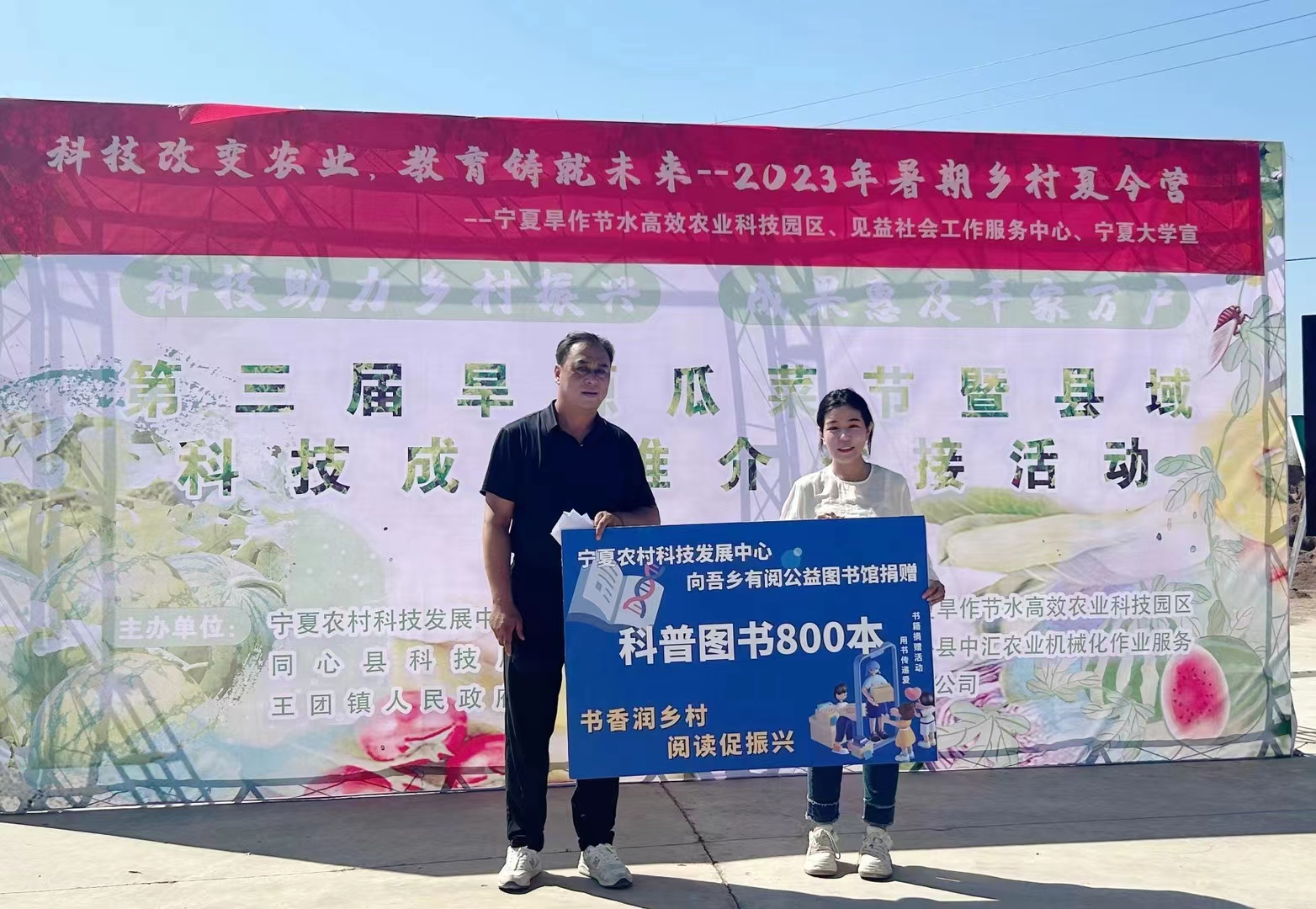 活动以“科技助力乡村振兴 节水惠及千家万户”为主题,集中展示了园区培育的西瓜、茄子、青椒、玉女果等农产品,以及“旱区农林复合高值高效产业模式”“设施蔬菜与羊肚菌轮作栽培”等7项科技成果。6名专家现场讲解了旱作节水技术,围绕科技成果引进转化对新型经营主体、科技致富带头人、村民开展了专题培训。活动中,自治区科技厅还向王团镇吾乡有阅公益图书馆捐赠科普图书800本,为王团镇安心敬老院赠送生态西瓜2000余斤。