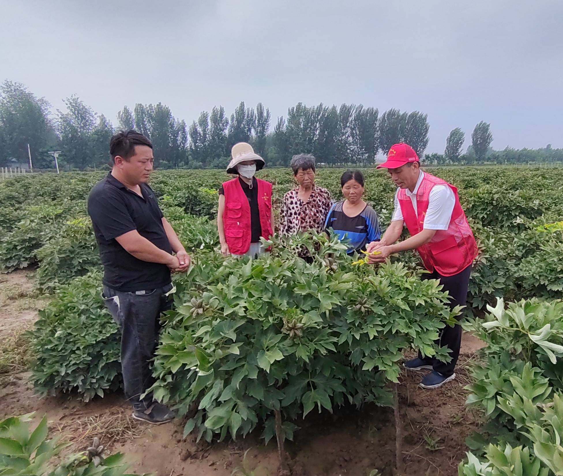 温增军一行现场察看了牡丹、芍药生长状况,就牡丹和芍药的夏季水肥管理、病虫害防治等进行答疑解惑。专家们指出,夏季是牡丹、芍药生长发育的营养积累、花芽分化的关键时期,也是病虫、杂草及旱涝危害的多发期。因此,切实加强牡丹、芍药的夏季科学管理,才利于牡丹、芍药健壮生长和良好发育,使牡丹、芍药翌年花多花大、色艳香郁。王海明研究员针对牡丹红斑病、牡丹灰霉病、牡丹根腐病、花叶病毒病、缺铁黄化症、地下害虫的发生危害和防治技术,向花农进行了现场培训,提出具体的指导意见,为助力产业发展贡献专家智慧和力量。工作人员还现场发放了《牡丹生产实用技术》手册和明白纸。