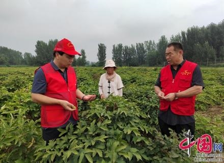 温增军一行现场察看了牡丹、芍药生长状况,就牡丹和芍药的夏季水肥管理、病虫害防治等进行答疑解惑。专家们指出,夏季是牡丹、芍药生长发育的营养积累、花芽分化的关键时期,也是病虫、杂草及旱涝危害的多发期。因此,切实加强牡丹、芍药的夏季科学管理,才利于牡丹、芍药健壮生长和良好发育,使牡丹、芍药翌年花多花大、色艳香郁。王海明研究员针对牡丹红斑病、牡丹灰霉病、牡丹根腐病、花叶病毒病、缺铁黄化症、地下害虫的发生危害和防治技术,向花农进行了现场培训,提出具体的指导意见,为助力产业发展贡献专家智慧和力量。工作人员还现场发放了《牡丹生产实用技术》手册和明白纸。