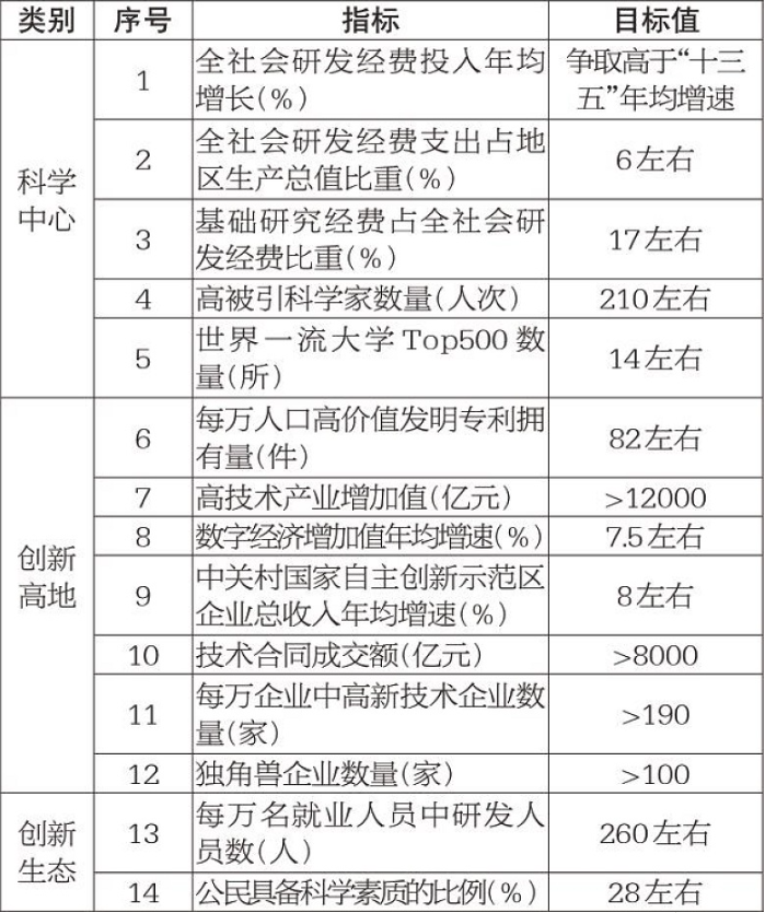 “科学中心”建设取得新进展。以国家实验室、国家重点实验室、综合性国家科学中心、新型研发机构、高水平高校院所以及科技领军企业为主体的战略科技力量体系化布局基本形成。全社会研发经费支出占地区生产总值比重保持在6%左右。基础研究学科布局与研发布局实现优化,基础研究经费占全社会研发经费比重达到17%左右,力争在核心领域取得重要技术突破和引领性原创发现,为有效解决重点领域关键“卡脖子”技术的突破提供源头支撑。高被引科学家数量当年达到210人次左右,顶级科技奖项获奖人数显著增加,世界一流大学数量质量实现双提升。