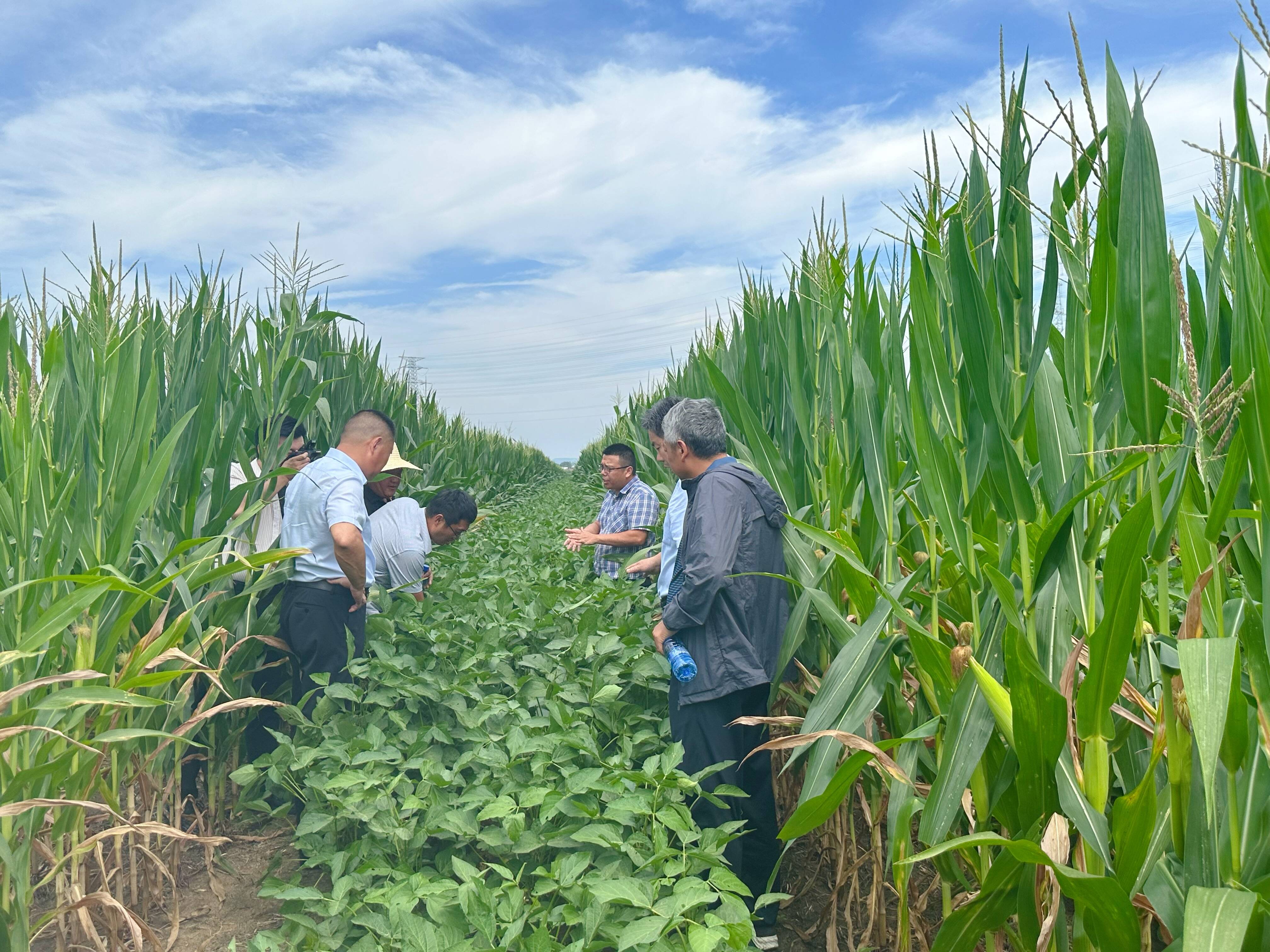 随后,记者跟随考察团一行来到位于贾汪区江庄镇的大豆玉米带状复合种植示范基地,一排排玉米苗、一垄垄大豆苗随着微风荡起层层绿色的波浪。科学的田间管理能够让这里的玉米不减产,多收一季豆,实现“一季双收”。考察团专家走进田地,对农户开展一对一指导。