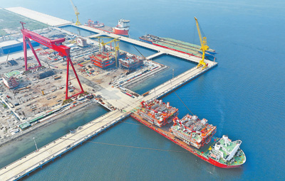 8月9日,渤海首个千亿方大气田渤中19—6凝析气田Ⅰ期开发项目的海上开采平台在海油工程天津智能化制造基地建造完工,为年内顺利投产提供了关键装备保障。该气田位于渤海中部海域,是我国东部第一个大型、整装、高产、特高含凝析油的千亿立方米级凝析气田。图为当日,渤中19—6凝析气田Ⅰ期开发项目组块装船作业现场。