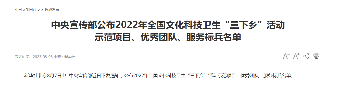 此次公布的示范项目、优秀团队、服务标兵,涵盖创新理论宣讲、农村文化建设、科技助农兴农、健康义诊服务、法治宣传教育等领域,工作成效好、群众认可度高、示范作用强,充分展现了“三下乡”活动的进展成效。