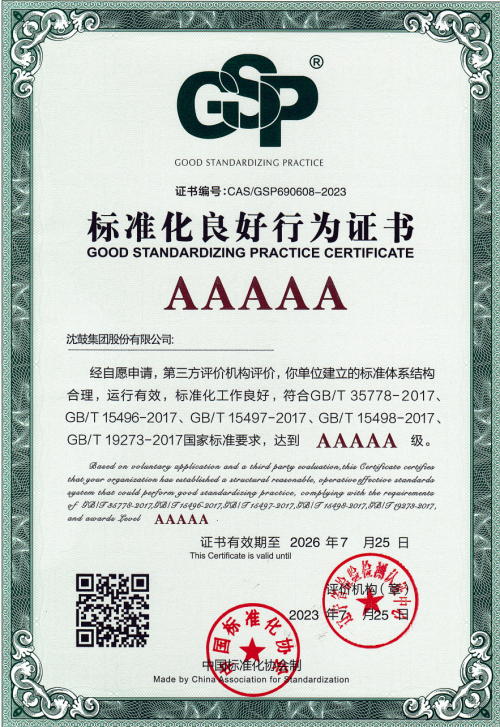 在辽宁省、沈阳市市场监督管理局的指导和支持下,沈鼓集团于2022年下半年开展企业AAAAA级标准化良好行为创建工作。在通过网上申报、初步评价后,第三方评价机构(辽宁省检验检测认证中心)组织多位标准化专家驻厂评价,通过现场检查、资料审查、部门/员工问查等形式对沈鼓集团进行严格审核查评。最终,沈鼓集团以总分436.6+44分(满分450+50分)的优异成绩通过了现场评价。2023年7月25日,沈鼓集团喜获“标准化良好行为AAAAA级企业”认证证书,成为目前为止辽宁省第一家AAAAA级(全国最高等级)标准化良好行为企业。