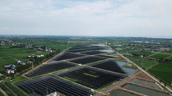 上海崇明绿华镇华星村千亩蟹塘的水面上覆盖着连片的太阳能光伏板(2023年7月25日摄,无人机照片)。新华社记者 金立旺 摄