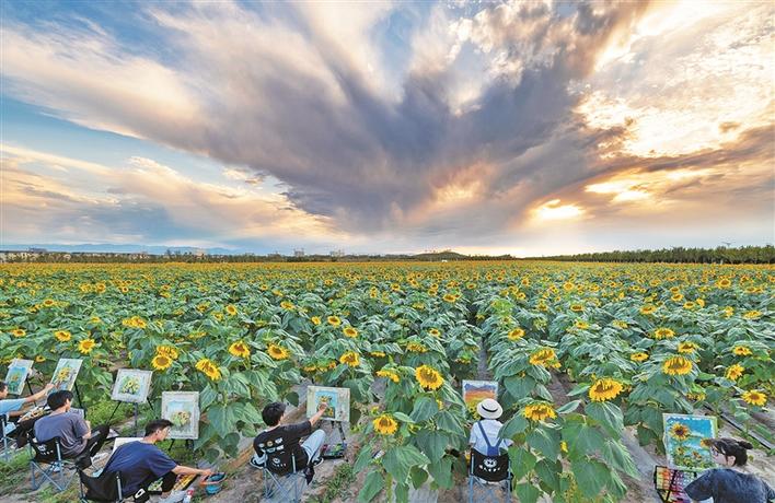 学生们在双河市向日葵园写生(资料图片)。周常乐 摄