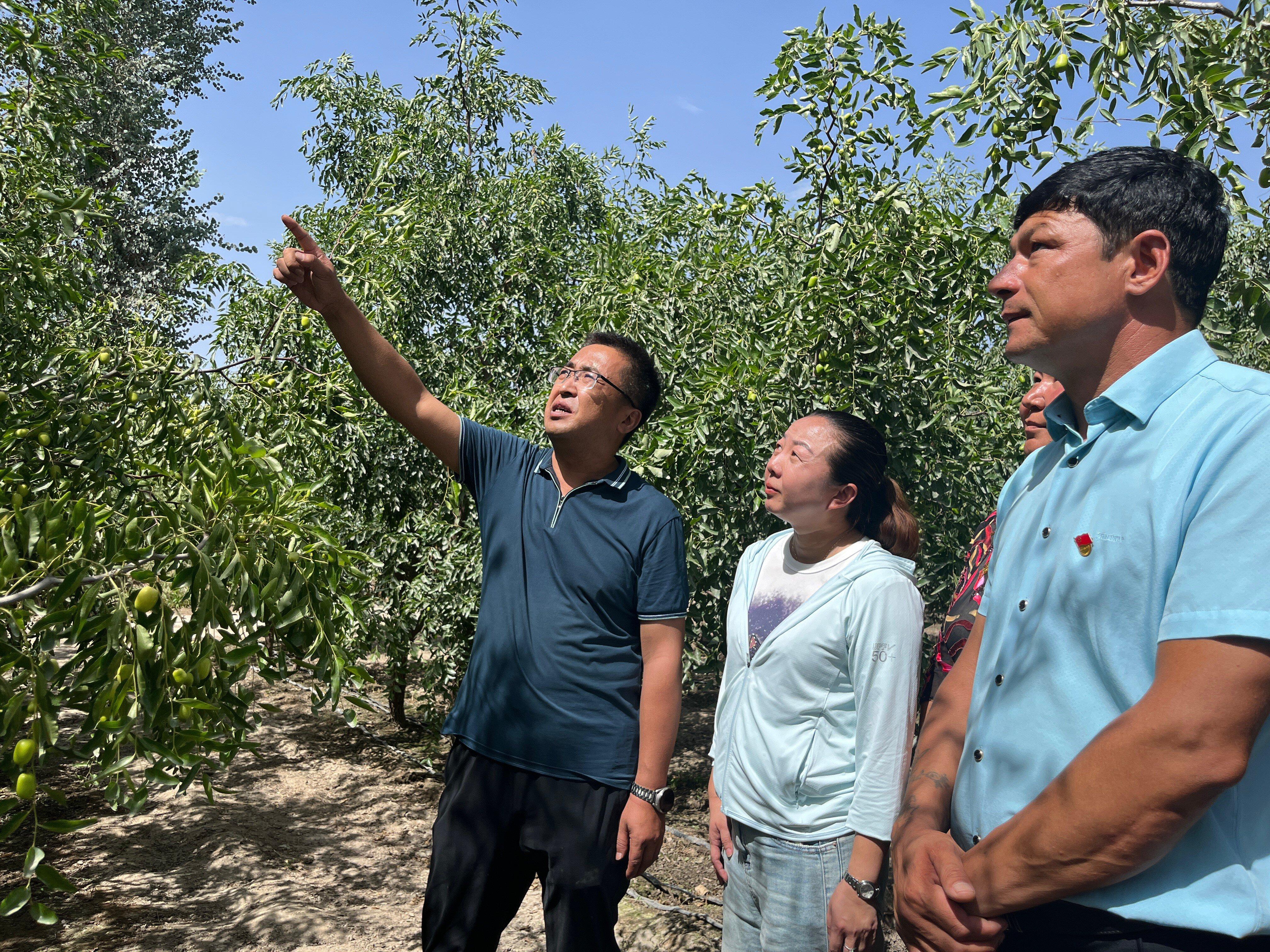 8月12日,来自新疆农垦科学院的专家在三师四十八团五连结对村博尔其墩村(十二村)红枣示范园内为村民讲解先进红枣栽培技术。