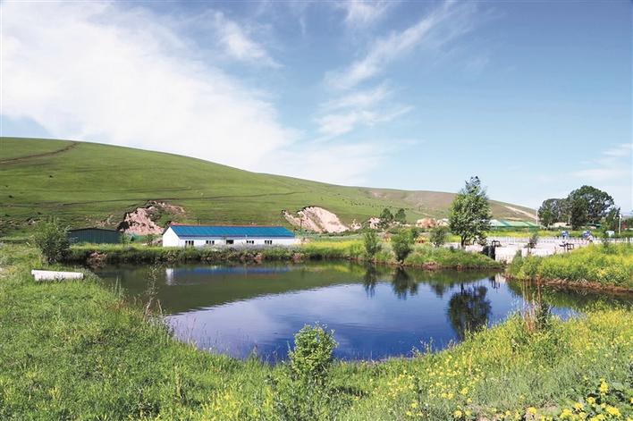 在四师七十七团冷水鱼养殖基地,泉水潺潺,绿草如茵,自然鱼池与生态美景相映成趣(资料图片)。高兴 摄