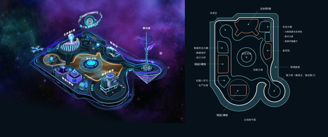 E展馆为元宇宙主会场,观众可以通过数字人漫游至会议中心门口,进入开幕式主论坛会场后,查看会议总体议程,在线观看议程直播,感受会议盛况。