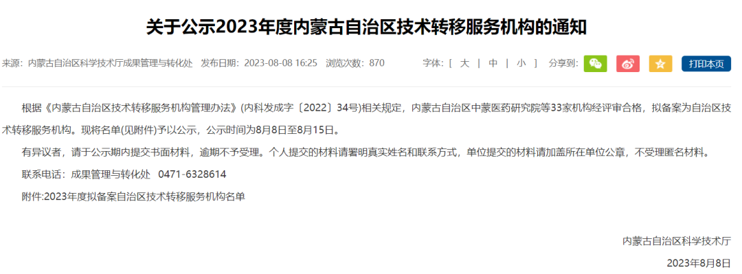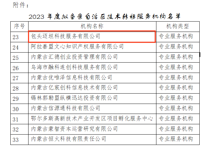 近日,内蒙古自治区科学技术厅发布了《2023 年度拟备案自治区技术转移服务机构名单》, 包头迈坦科技服务有限公司成功获批自治区级技术转移服务机构。