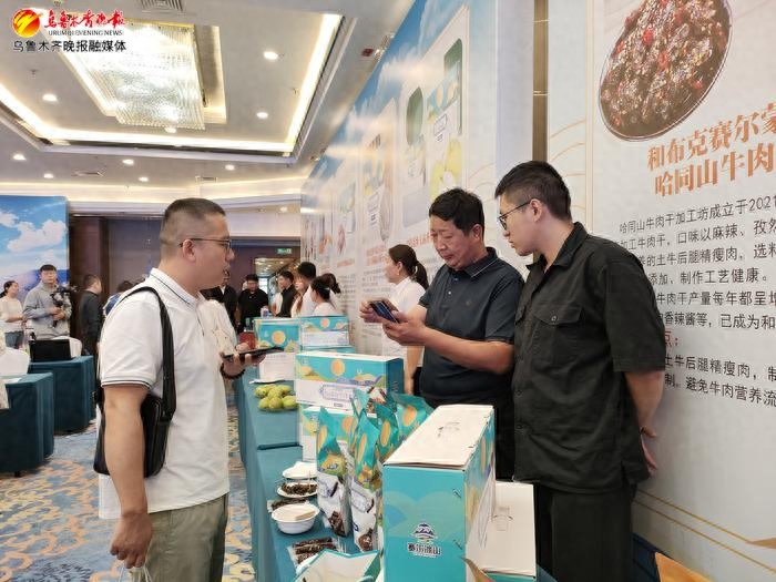 8月16日,在和布克赛尔县县域公共品牌新品发布会暨线上线下渠道对接会上,经开区(头屯河区)的企业正在了解和布克赛尔县的优质农副产品。记者唐红梅摄