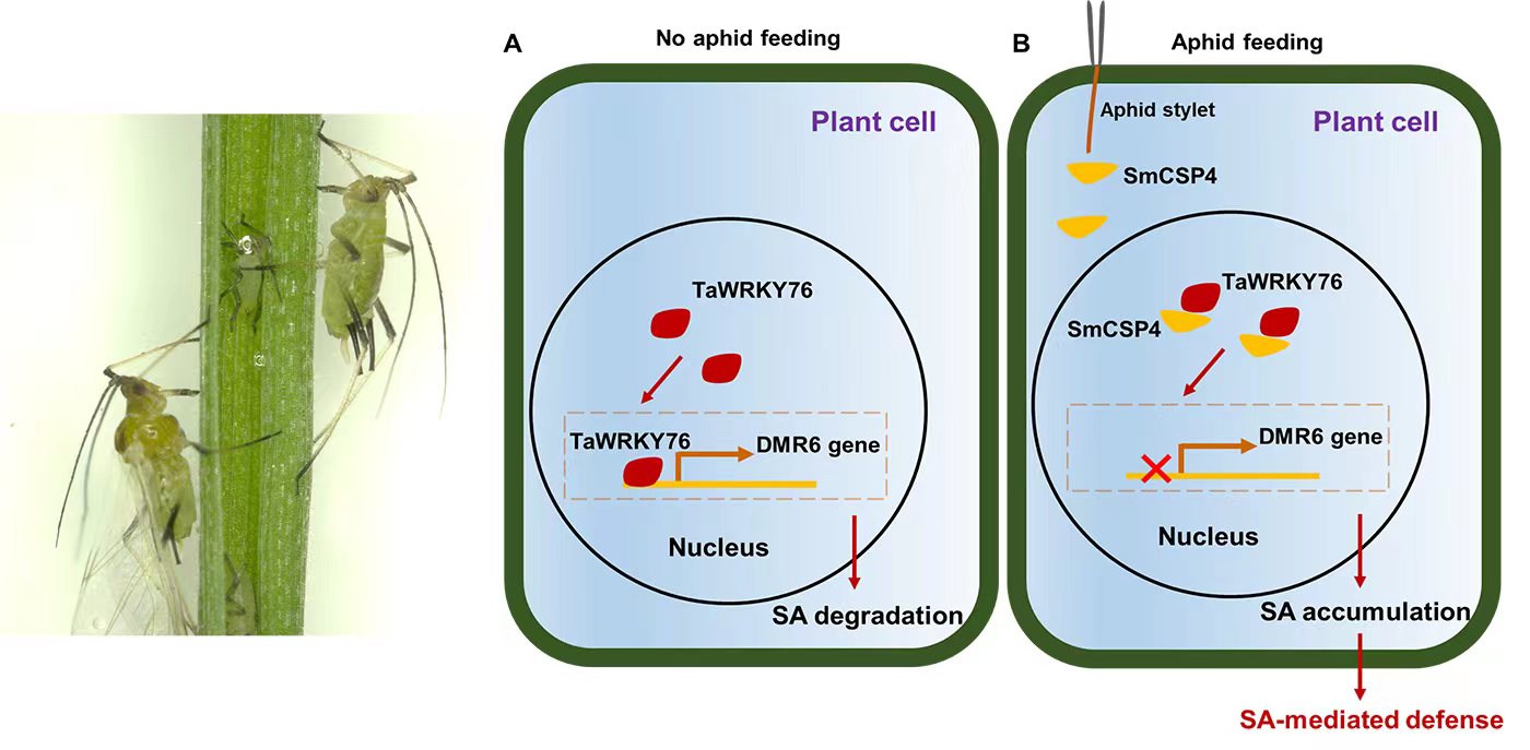 麦蚜是我国一类农业害虫,研究麦蚜与小麦互作关系、明确小麦抗蚜分子机制,可为小麦抗蚜品种培育提供理论基础。该研究发现,化学感受蛋白SmCSP4在麦长管蚜唾液腺中高表达,在蚜虫取食过程中可被分泌到小麦组织内,该蛋白与小麦转录因子TaWRKY76互作,抑制水杨酸降解酶DMR6基因的表达,导致小麦植株水杨酸含量增加,从而激发水杨酸介导的小麦防御反应通路,引起小麦胼胝质和过氧化氢大量积累,提高小麦抗蚜性,使麦蚜在小麦韧皮部取食历期缩短、蚜虫存活率与繁殖率显著下降。