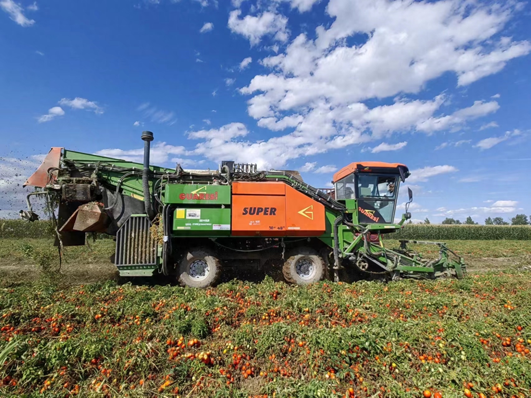 新式采收机正在采收番茄。