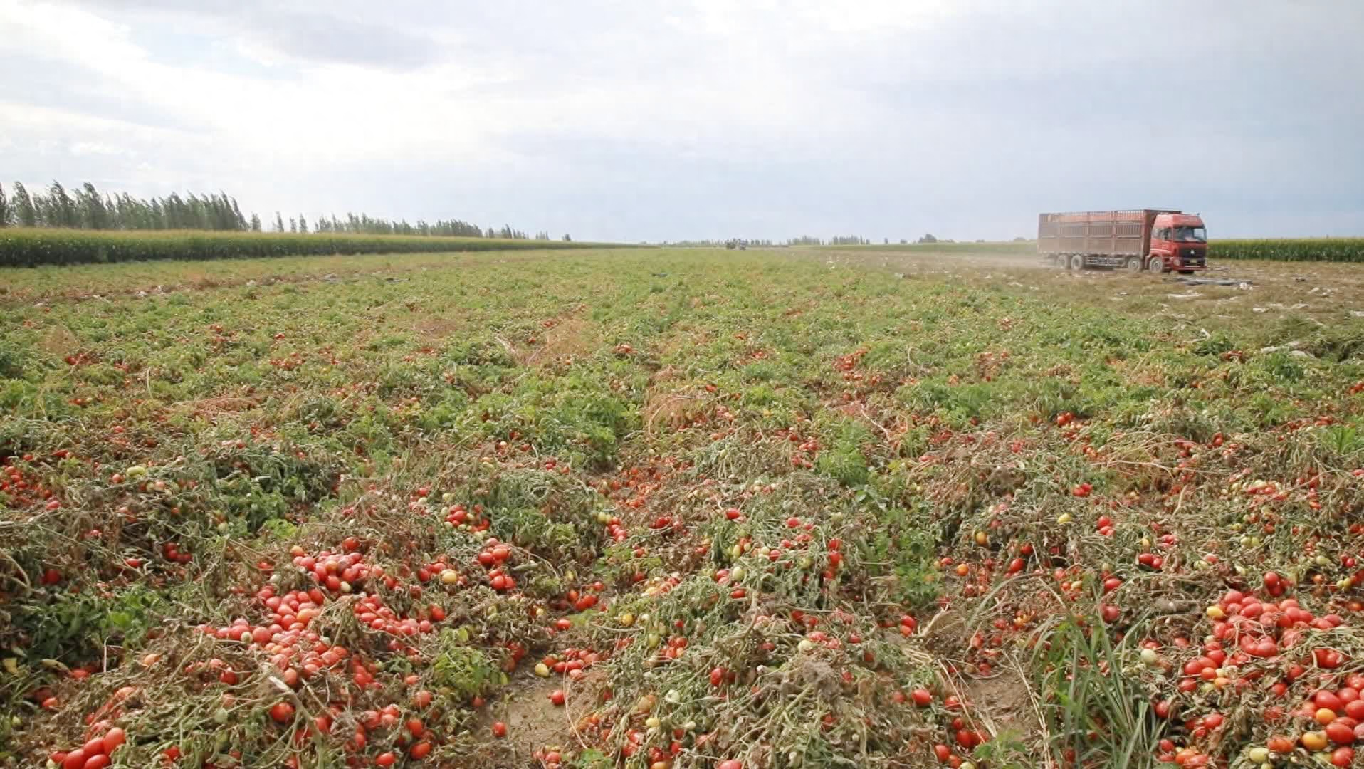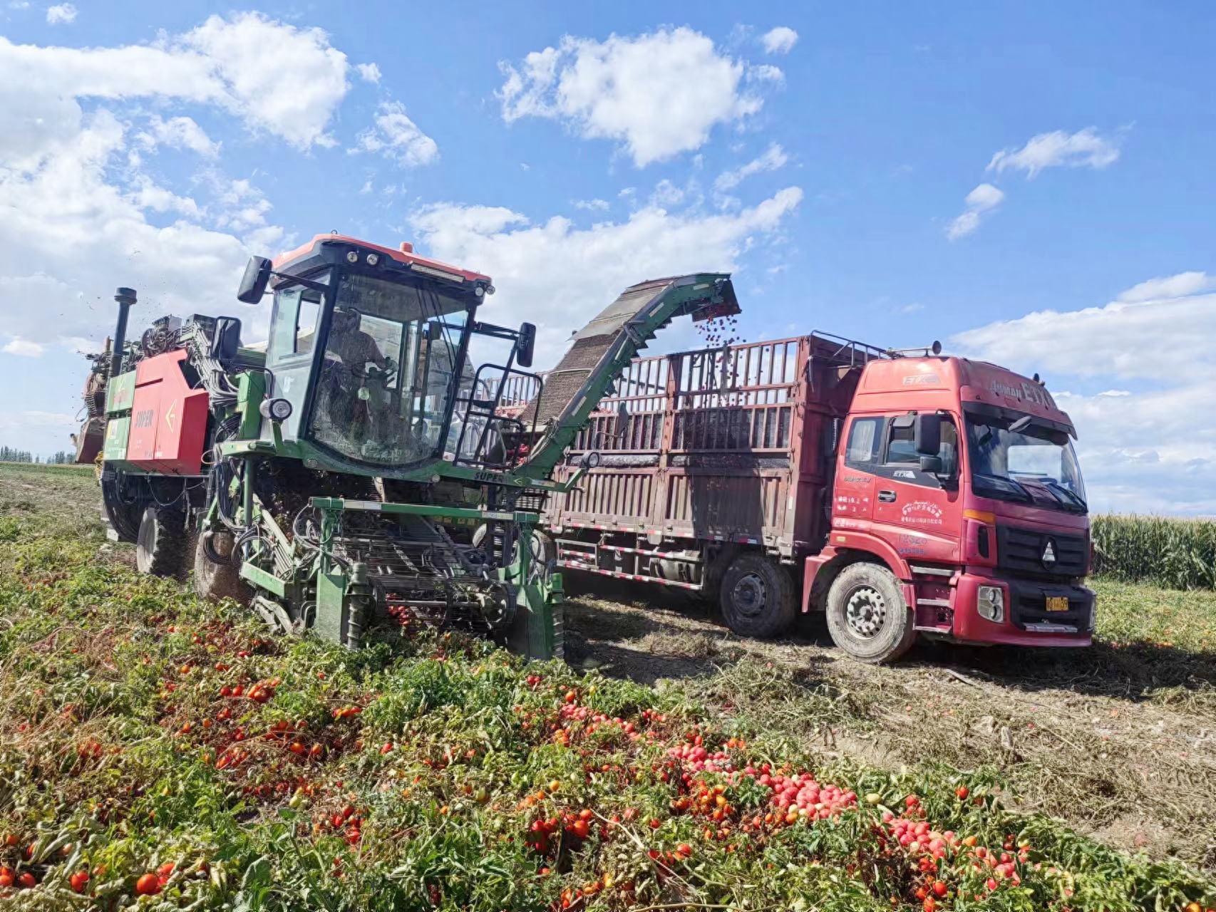 番茄采收机、卡车来回穿梭在田间,实现番茄收割、采摘、筛选、装运一次性完成。