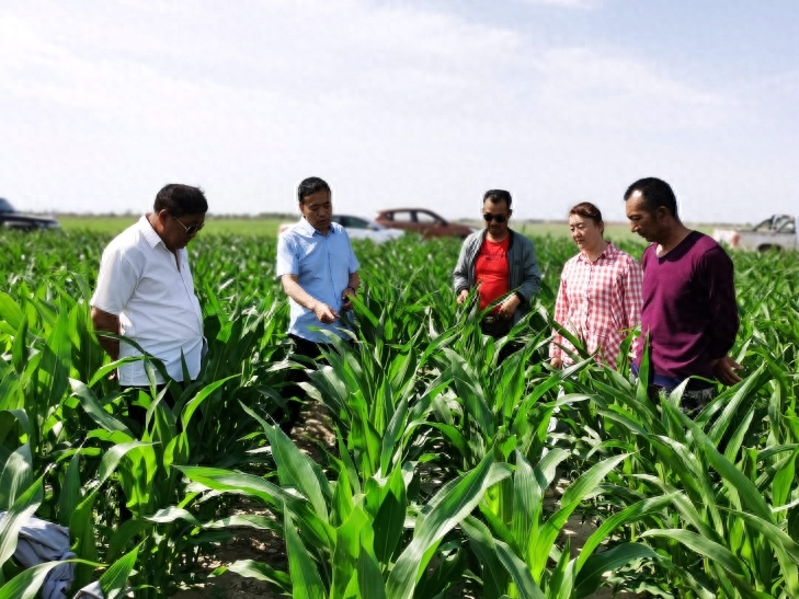 6月12日,一二一团农发中心技术员喻峰华来到四连职工马军树的玉米地,查看玉米长势。张文彪 摄