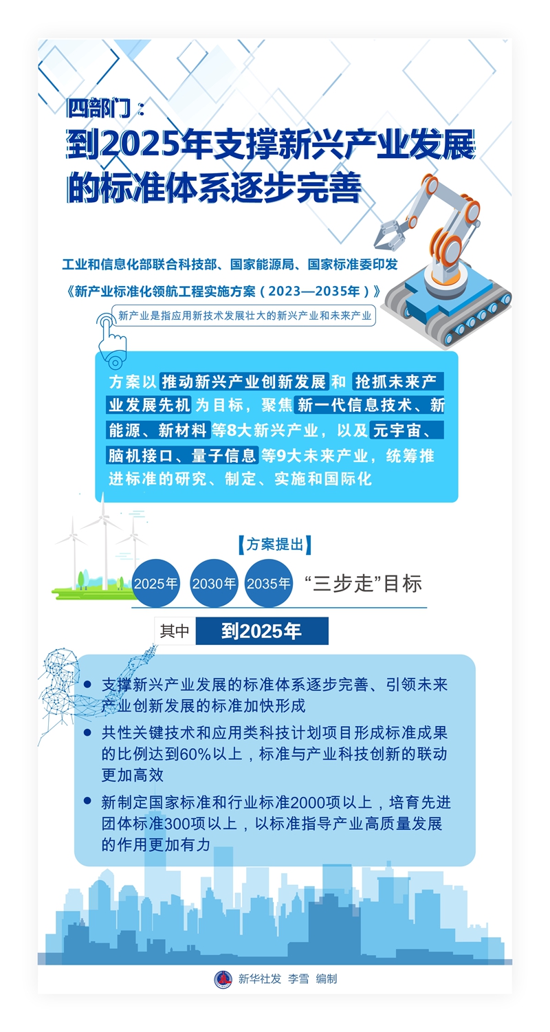 记者22日从工业和信息化部获悉,工业和信息化部联合科技部、国家能源局、国家标准委印发《新产业标准化领航工程实施方案(2023—2035年)》,通过持续完善标准体系建设,引领新兴产业、未来产业等创新发展。