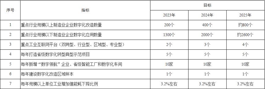 从2023年起,力争每年新增重点工业互联网平台1家,打造省级数字化转型典型示范项目5个,新增“数字领航”企业、省级智能工厂和数字化车间10家,建设数字化改造区域样本1个,规模以上单位工业增加值能耗降低3.2%左右。到2025年,实现全市重点行业规模以上制造业企业数字化改造全覆盖、规模以下制造业企业数字化应用全覆盖,推动重点行业全员劳动生产率达到长三角平均水平,制造业数字化转型工作进入全省前列,制造业高端化、智能化、绿色化水平显著提升。
