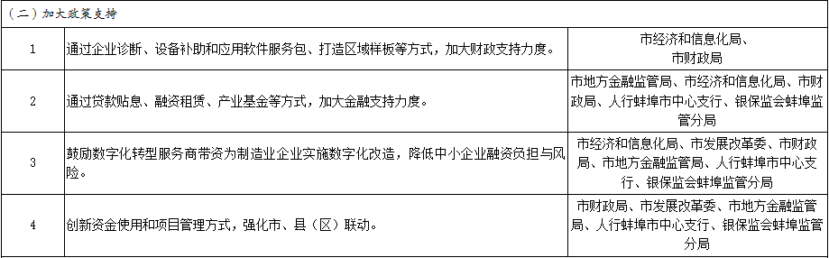 (二)加大政策支持。通过企业诊断、设备补助和应用软件服务包、打造区域样板等方式,加大财政支持力度。通过贷款贴息、融资租赁、产业基金等方式,加大金融支持力度。鼓励数字化转型服务商带资为制造业企业实施数字化改造,降低中小企业融资负担与风险。创新资金使用和项目管理方式,强化市、县(区)联动。(责任单位:市经济和信息化局,配合单位:市发展改革委、市财政局、市地方金融监管局、人行蚌埠市中心支行、银保监会蚌埠监管分局)