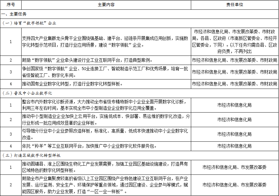 (一)培育“数字领航”企业。支持四大产业集群龙头骨干企业围绕强基础、建平台、延链条开展集成应用创新,实施数字化转型示范项目,打造行业应用场景,建设“数字领航”企业。鼓励“数字领航”企业牵头建设行业工业互联网平台,打造典型案例。争创国家级“数字领航”企业、5G全连接工厂、智能制造示范工厂和优秀场景,培育一批省级智能工厂、数字化车间。推动国有企业数字化转型,打造行业数字化转型样板。〔责任单位:市经济和信息化局,配合单位:市发展改革委、市财政局,各县、区政府(市高新区管委会、市经开区管委会,下同)。以下任务均需各县、区政府负责,不再列出〕