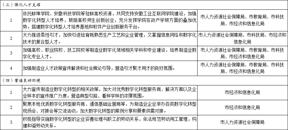 (三)强化人才支撑。依托蚌埠学院、安徽科技学院等驻蚌高校资源,共同支持安徽工业互联网学院建设,加强数字化转型人才培养,鼓励高校师生创新创业,充分发挥学院在政产学研方面的叠加优势,搭建数字化转型人才培养基地和软件产业创新服务平台。大力推进柔性引才,加快引进培育既熟悉生产工艺和企业管理,又掌握信息网络和数字化技术的复合型人才。加强高校、职业院校、技工院校等制造业数字化领域相关学科和专业建设,培养制造业数字化专业人才。加强制造业人才政策宣传解读和社会舆论引导,营造引才聚才用才的良好氛围。(责任单位:市人力资源社会保障局、市教育局、市经济和信息化局,配合单位:市科技局)